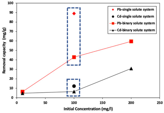 The results of Cd2+ and Pb2+ adsorption from the binary solute system shown in Figure 4c,d, indicates the occurrence of competition for HPCs’ adsorption surface sites.