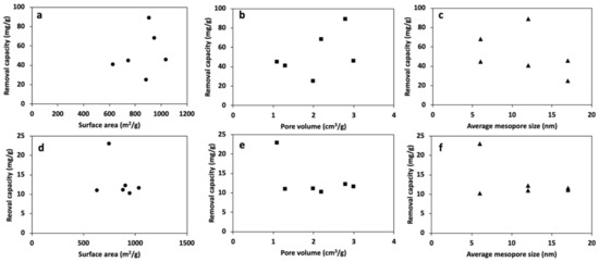Removal capacity vs. (a,d) surface area, (b,e) pore volume, (c,f) average mesopore size of HPCs for Pb2+ (a–c) and Cd2+ (d–f) in a single solute system.