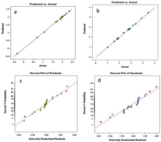 Evaluation of the normality of the responses was carried out through the standard probability plots of the residuals displayed in Figure 9a,b. As illustrated, the experimental responses were approximately normally distributed based on these plots depicting a nearly straight line. In Figure 9c,d, the plots of predicted values (based on a fitted model) vs. the actual response values for Cd2+ and Pb2+ are provided. These plots indicate the existence of a good correlation between the actual and predicted response data.