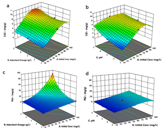 Figure 10 depicts the simultaneous effect of the factors’ AB and AC interactions on the adsorbed amount of Cd2+ and Pb2+. In Figure 10a,b, an increased uptake of Cd2+ can be observed as A and B were increased simultaneously, followed by a slight decrease in uptake, which is noted after the optimum condition was achieved. The optimum conditions of the two factors were found to lie around higher values of A (60–90 mg/L) and B (4–5 g/L). In the case of factor C, its increase led to a significant Cd2+ uptake as factor B was increased simultaneously. The optimum range for factor B, as shown in the figure, was found to be around pH 6–7.