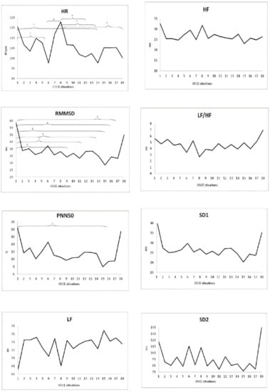 The MANOVA results showed significant differences between the situations analyzed (Wilks lambda = 0.638; F = 2.104; p = 0.000; η2 = 0.055). We found that HR was significantly higher in the pre (M1) than in the break situation (M6) (115.5 ± 3.2 vs. 97.7 ± 3.2 bpm; p = 0.019), and the respiratory evaluation (M14) (115.5 ± 3.2 vs. 97.6 ± 3.2 bpm; p = 0.018). HR was also significantly higher in the CPR scenario (M8) than in the break situation (M6) (117.9 ± 3.2 vs. 97.7 ± 3.2 bpm; p = 0.002), nutritional evaluation (M12) (117.9 ± 3.2 vs. 100.6 ± 3.2 bpm; p = 0.032), respiratory evaluation (M14) (117.9 ± 3.2 vs. 97.6 ± 3.2 bpm; p = 0.002), and the post OSCE moment (M18) (117.9 ± 3.2 vs. 100.2 ± 3.4 bpm; p = 0.031).