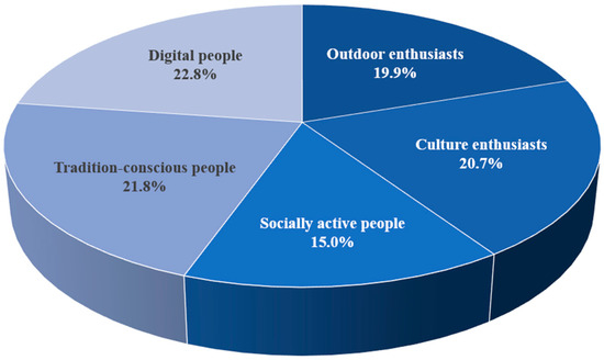If the Kaiser-Meyer-Olkin criterion (KMO) is considered across all variables for leisure orientations (mobility orientations), a value of 0.805 (0.861) is the output for the correlation matrix. If the KMO criterion is considered variable-specific, no variable is below the threshold value of 0.5 for either orientation [27]. As such, it can be concluded that the variables are suitable for factor-analytical purposes, and all 27 (26) variables can be used for the analysis. Based on a plausibility assessment and a termination criterion with an eigenvalue greater than the value 1, seven (eight) factors were generated. The seven (eight) factors explain 51.6% (58.0%) of the variance. Appendix B presents the rotated component matrices for both leisure and mobility orientations.
