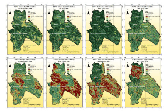 Spatial distribution of NDVI classes before and after the 1991, 2003, 2017, and 2019 wildfires.