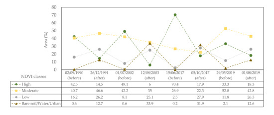 Before the 1991 fires, the most represented NDVI classes in the study area were high and moderate. These areas correspond to agriculture and forestry (Pinus pinaster Ait.). According to Silva et al. [46], they were the main land occupation in 1990, with 49% and 19% of the Mação municipality area, respectively. After the 1991 wildfires, the high class suffered an important decrease, and the remaining classes consequently increased, particularly the low and bare soil/water/urban (which was null before the fires) classes.