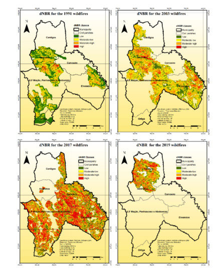 Spatial distribution of dNBR classes before and after the 1991, 2003, 2017, and 2019 wildfires.
