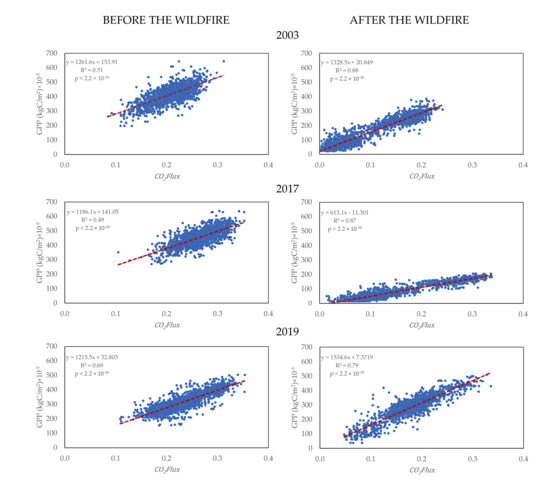 Linear regression between CO2flux and GPP in KgC/m2 × 10−4 before and after the wildfires of 2003, 2017 and 2019.