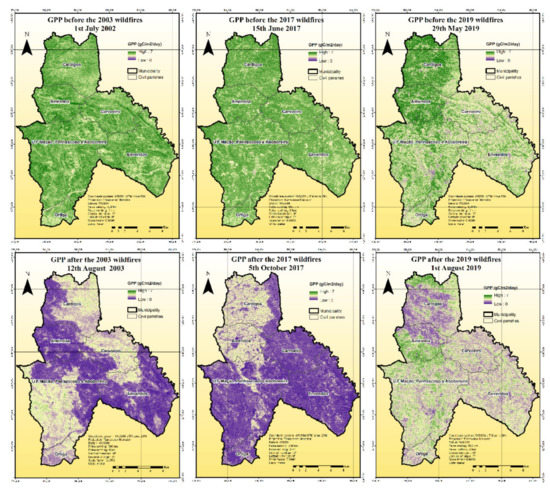 Figure 6 shows the spatial distribution of GPP in the study area before and after the fires of 2003, 2017 and 2019. Before the fires, the study area mostly comprised a continuous patch, nonfragmented shrubs, Eucalyptus globulus Labill., and Pinus pinaster Ait. [28]. This area presented very high GPP values, with averages of 5.4 and 5.3 gC/m2/day in 1 July 2002 and 15 June 2017, respectively, thus showing good efficiency in the carbon-capture process. Before the 2019 fire (29 May 2019), the average GPP was 4.7 gC/m2/day, showing capacity for the rapid regeneration (in less than 2 years) of shrub and Eucalyptus globulus Labill. After the 2003 and 2017 wildfires, the affected areas presented an average GPP of 1.2 gC/m2/day, showing that nonindigenous forests were not very resilient to fires. Santana et al. [56] stated that forests that had burnt down are now more vulnerable to the loss of the organic carbon. This carbon, which is stored at the top 5 cm layer, can be easily mobilized by water erosion after the first rains.