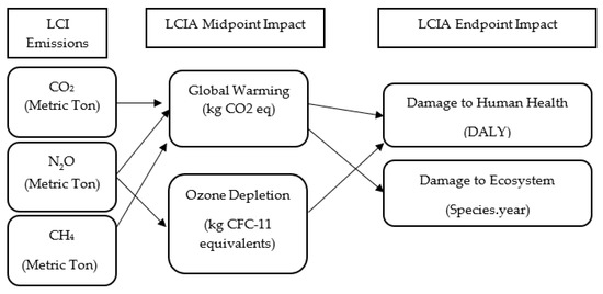 Although LCA studies (whether process LCA or IOA is used) provide results of life cycle inventory (LCI), it is also crucial to study the ripple effects of these inventory results on the planet, termed as life cycle impact assessment (LCIA). Recent reports state that the primary driver of global warming is the human expansion of the “greenhouse effect” [17]. According to NASA [18], the greenhouse effect is the increase in temperature that results from the trapping of Earth’s heat radiating towards space by the atmosphere. These impacts are categorized as midpoint and endpoint impacts. Moreover, the main difference between midpoint and endpoint impacts could be understood by the respective different stages in the cause and effect chain when calculating the effect. For example, one of the midpoint impacts of Nitrous oxide (N2O) emissions to air is ozone depletion. On the other hand, the endpoint impact of N2O emissions, which refers to looking at the end of the cause-effect chain, is the damage to human health due to ozone depletion. In other words, N2O emissions will eventually damage human health through ozone depletion [18,19].