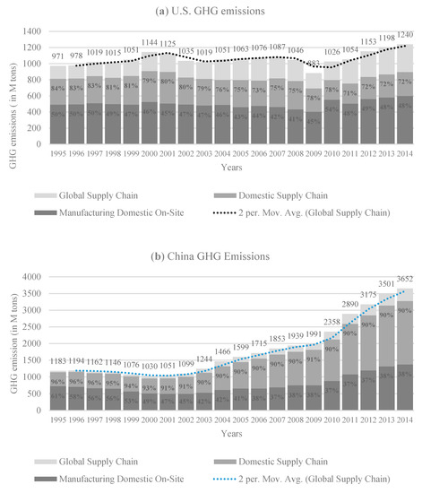 In comparison, China’s total GHG emissions are illustrated in Figure 5b. From the figure, China’s GHG emissions had a slight drop in GHG emissions in the years 1997, 1998, 1999, and 2000. However, starting in 2001, the GHG emissions of China’s manufacturing have experienced a continuous increase. Moreover, manufacturing domestic onsite percentage share and the domestic supply chains’ percentage shares decreased in recent years. However, global supply chain-linked emissions increased. Since 2008, about 4 trillion yuan has been invested in manufacturing industries to boost domestic consumption and economy, which resulted in increasing GHG emissions from metal and non-ferrous metal production. The twelfth five-year plan was issued for energy conservation and GHG emission reduction, which reduced the rate of GHG emission from onsite and domestic supply chain activities since 2012 [47].