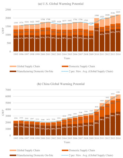 The impacts of U.S. manufacturing on global warming is shown in Figure 6a. For the years before the U.S. economic crisis, the GWP did not seem to create severe fluctuations across the years. However, an increasing trend exists for the years after the economic crisis in 2008. Although the GHG emissions of 2010 were lower than the ones in 2011, the GWP of 2010 was higher than in 2011. This is because the amount of CH4 emissions in 2010 was higher than the CO2 and CH4 GWP characterization factor, which is 34 times larger than the CO2 characterization factor. Similarly, the GWP results of China’s manufacturing on global warming are depicted in Figure 6b. Since 2002, it is evident that China’s manufacturing industries’ GWP impact is on a continuous rise, compared to a less steep rise observed in the U.S. manufacturing graph in Figure 6b.