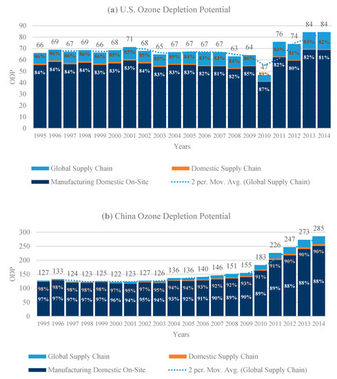 Figure 7a shows the trend of ozone depletion impacts of U.S. manufacturing. There is an inherent fluctuation, continuous until 2009, which seems to have a relatively small range. However, in 2010, a crucial amount of drop was observed in the ozone depletion potential, and after 2010, the ozone depletion potential was on an increasing trend. The GHG emissions of 2012 were found to be more substantial than in 2011. However, the ODP of 2012 was found to be relatively lower than in 2011. This could be attributed to the share of N2O emissions in 2011 being higher than it was in 2012. Similarly, the ODP impact of China’s manufacturing industry was shown in Figure 7b. The ODP results of China seem to be relatively aligned with the GWP results of China. The ODP of China manufacturing was found to be on a continuously increasing trend starting from 2003 to 2014.