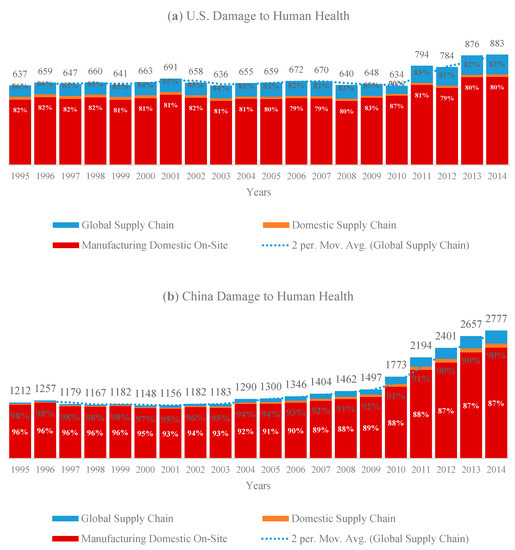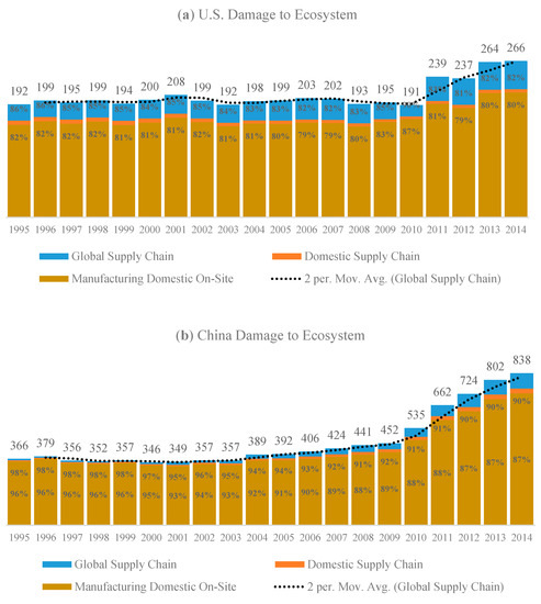When we compare the damage to ecosystem ratio of China to U.S., the ratio was 1.9 in 1995, and jumped to 3.15 in 2014 according to the Figure 9a,b. Unfortunately, the damage estimations to the ecosystem were non-decreasing in both countries and in China it has gotten significantly higher especially in the last 5 years of study period. In both countries, onsite manufacturing activities dominate the endpoint impacts, which was followed by the global supply chains.
