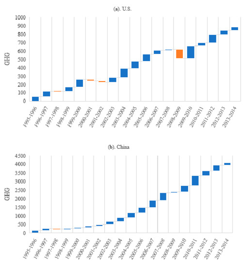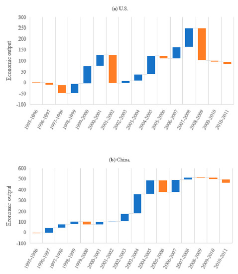 In Figure 10a, the effect of change of interindustry demand in the U.S. on the total GHG emissions is depicted. In the Figure, the blue color code represents an increase and the orange color code indicates a decrease. The chart shows that the total economic output drops significantly in 2001–2002 and 2008–2009. Similarly, Figure 10b shows the effect of change of interindustry demand in China on the total GHG emissions. Overall, the effect of China’s interindustry demand is to instigate an increasing trend over the study period, compared to more severe fluctuations in the interindustry demand of the U.S.
