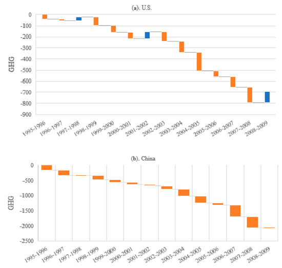 Figure 12a shows the SDA results of GHG emissions’ coefficients for the U.S. Similarly, Figure 12b shows the change in China’s GHG emissions intensity over study period. Unlike the final demand, the GHG emissions coefficients decreased across the years; this clearly indicates that the GHG emission intensity of both countries’ manufacturing activities are on a decreasing trend. These facts reveal that the effect of the GHG emission coefficient is more minor than final demand. The drop in GHG emissions per output unit in manufacturing activity could shift towards manufacturing industries that are less dependent on fossil fuel energy.