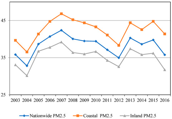 The average PM2.5 index of 216 cities in China from 2003 to 2016 is shown in Figure 2. It can be seen from Figure 2 that fluctuations were present in the downward trend of the overall PM2.5 index during 2003–2016. However, the PM2.5 index showed an upward trend from 2003 to 2007 before declining in 2008. A short-term recovery in 2013 could not retard the downward trend as a whole, which was closely associated with the Chinese government’s emphasis on energy conservation and emissions reduction. It is noteworthy that the PM2.5 index in coastal areas appeared higher than the national average, while the haze concentration in inland areas was lower than the national average value. This can be explained by the relatively developed economy in coastal areas, especially the high concentration of gases emitted by manufacturing factories and urban automobile exhaust. Therefore, the pollution was more serious than that in other regions.