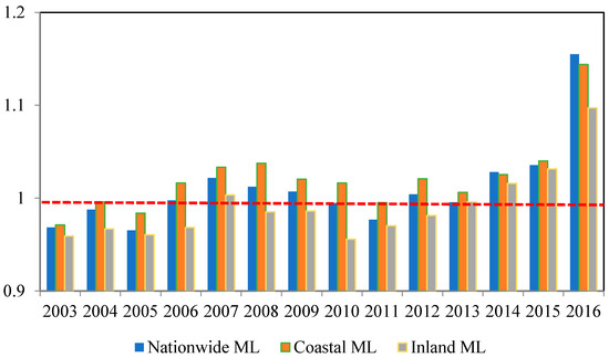 The Malmquist–Luenberger (ML) values of 216 municipal units from 2003 to 2016 were averaged in this study to obtain the average value of ML nationwide. The Malmquist–Luenberger (ML) index is the annual growth rate of green total factor productivity (GTFP). When the ML index is greater than 1 (red dotted line), a greater GTFP value of the year is obtained compared to the previous year and vice versa; the value declines compared with the previous year, which also directly affects the trend of GTFP. As can be seen in Figure 3, the ML value of 216 municipal units in China presented an rising tendency. It revealed that in recent years, though the country and government departments have considered resource consumption and pollution emissions constraint, more attention to China’s economic quality is still needed, and there was no situation in which economic growth was at the expense of resources and environment. In terms of different regions, the ML index value for coastal areas was higher than that of inland areas. The main promising reason that may be posited is that the coastal areas realized better economic development, had the economic capacity and full motivation to facilitate technological innovation promoting industrial transformation and earlier upgrading, and thereby led the development of national technological progress. At the same time, the insufficient marketization level, low management level, and unfavorable resource allocation efficiency of the inland areas obviously restricted the improvement of technical efficiency.