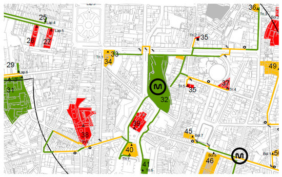 According to Portuguese legislation, the network of accessible paths must be continuous and consistent, cover the entire urbanized area, and function in coordination with urban functions and activities pertaining both to public and private sectors [41]. This principle formed the basis for the initial configuration of the network. Intervening in 522 km of streets that compose the city of Porto would be unrealistic, as even the surveying and project stages would risk becoming outdated even before the intervention started. Following the main principles of the SEC, an intervention aiming to improve the role of public space as a structuring element of the urban system should follow basic network and continuity principles. Given the importance of public transport for the connection of key areas of a broader urban area, the metro system was adopted as the backbone of this strategy. Opened to the public in 2003, it connects the urban centre of Porto with its neighbouring municipalities, serving a considerable portion of both population and city services, thereby allowing the plan to acquire an inter-municipal scale. Being a product of the XXI century, Porto’s metro system takes into account current accessibility standards, for physically and visually impaired people, inside its stations and vehicles. A stretch of 9.3 km, encompassing two intersecting lines and seventeen stations, was selected for the first stage of this project. The intervention area for SIA encompassed a 500 m radius from each station, corresponding to a walkable distance of roughly under ten minutes.