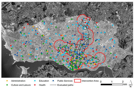Due to the vast expanse of public spaces, combined with the limited financial means of public authorities, first and foremost, a definition of a hierarchy of interventions was required. In line with the values of a democratic society, any strategy should factor in public buildings and facilities, but also locations that are used by large amounts of visitors. It is also necessary to account for building density and concentration of existing services, as well as their connections to various interest points of the urban structure, by defining legible and coherent links [17]. This notion of a network is essential to avoid isolated spatial interventions, which would undoubtedly reduce its effectiveness. Even though many urban agglomerations have human scale features that limit most travel needs to short distances [18], other larger urban area trips can be more extensive. The limitations of certain vulnerable, physically disabled, and older groups of the population [6] make the dependence solely on pedestrian travel unfeasible. Public transport stands out, then, as a complement to citizen mobility and as an enabler of social inclusion, but only if universal access is guaranteed [15].
