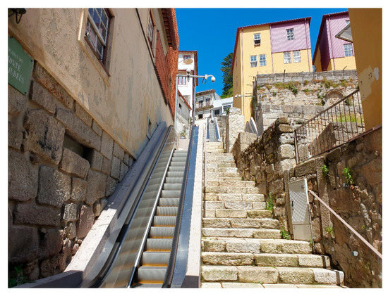 These efforts pose an undeniable contribution to concerns over the human scale of cities, linking the improvement of walkability conditions and the need to increase the liveability of public spaces. Such actions can be crucial to the revitalization of certain urban areas, through the creation of new ownership routines and social capital reinforcement. Given the nature of the SIA of connecting some of the major attractions of the city, important synergies can be boosted if linked with accessible tourism strategies [69,70]. As the implementation of differentiated services tends to, indirectly, favour discrimination, accessible tourism defends a fuller integration of actions and services, to which the information provided by SIA online database can be crucial. From the point of view of accessibility, old historic centres, such as Porto, can be easily criticized, due to the low quality standards of some narrow streets, the inadequate pavements and the existence of stairs and steps. The financial crisis of 2008 had a strong impact in public budgets and on the efforts initially launched by several municipalities. Still, in this city, the municipality has shown a recent, and strong, commitment in solving the most pressing issues related to irregular topography of its historic centre, with the meticulous installation of mechanic features (escalators) at some of its steepest areas (Figure 5).