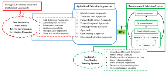 Smallholder livestock production is an important component of the agricultural economy. However, smallholder farmers continue to lag in commercialization, and this is caused by many challenges and constraints. Some of the major challenges include the shortage of inputs, low formal market participation, land degradation, poor access to financial resources, lack of skills, and limited access to extension services. Agricultural extension invariably helps to bring agricultural information, inputs, and improved technologies and facilitates access to markets and credit facilities by smallholder farmers for improved productivity and livelihoods. Sustainable agricultural development among smallholder livestock farmers can be achieved by adopting and applying extension approaches that fit into the condition of the farmers. They are various extension approaches that are being used to support the smallholder agricultural development agenda in developing countries. Some of these approaches include technology transfer approaches (Ministry-based and T&V), the commodity specialized approach, participatory extension approaches (FFS and project (integrated) approach, farming systems research and extension approach), cost-sharing approach, and education institution approach. Public extension is the chief source of extension services for smallholder farmers in developing countries; however, it has remained deficient due to various systemic challenges, which are complex and multifaceted. It is deemed to be heavily under-resourced, costly, overstretched, unaccountable, and often beset by bureaucratic processes. The inefficiency of the extension system often restrains farmers from addressing their everyday challenges and seizing various developmental opportunities. Failure by the public extension system to effectively support the ever-expanding smallholder livestock sector calls for innovative strategies to revolutionize the system. To this end, this paper discusses a practical expression on the potential role of ICTs such as mobile phones and the internet in revolutionizing public extension and its support towards smallholder farmers. The proliferation of mobile phones and the internet is envisaged to present an opportunity for the development of innovations that improve timely access to localized information and close the farmer–extension–research gap.