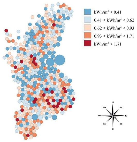 The aspect of wastewater treatment that we would like to highlight is its high energy consumption, which, as mentioned above, is associated with significant economic costs and greenhouse gas emissions. In other words, improving the energy efficiency of this activity and replacing its energy consumption based on fossil fuels with consumption from renewable sources are key aspects. In this sense, the first point is to show the energy consumption of the wastewater treatment plants in the Region of Valencia, which is done by means of Figure 1. This map shows the flow treated per year (size of the circle) and the average energy consumption (colour of the circle). As can be seen, the larger plants have a low energy consumption, but these are not very numerous, as there is a large number of small installations. Thus, a large dispersion can be observed between plants of similar size, with the northern part of the region not having a particularly high average energy consumption despite the high number of small plants. In the central part, although there is a greater number of plants with high consumption, there is also a large number with low consumption. However, the situation in the southern part of the region is very different, as the proportion of plants with high consumption is higher than in the other two parts of this region. In other words, it is possible that there is some important difference that conditions the activity in this region.