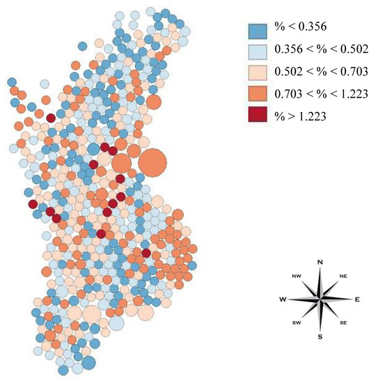 For more information about the plants, Figure 2 shows the population served (size of the circle) and the proportion of the project flow utilised (colour of the circle). On this occasion, what we can see is how, in general, the installed capacity is not being utilised. In this sense, the utilisation of the installation cannot be forced, and it could be the case that certain plants are designed to be able to withstand the flow of wastewater at the time of peak consumption. For this reason, in annual terms, these plants may appear to be underutilised, as for a large part of the year the installation does not receive a large amount of wastewater. However, even in this case, there are a significant number of plants with very low-capacity utilisation, such that more treatment capacity is available than necessary. Moreover, this wasted capacity is concentrated in smaller plants, especially in the northern part of the region.
