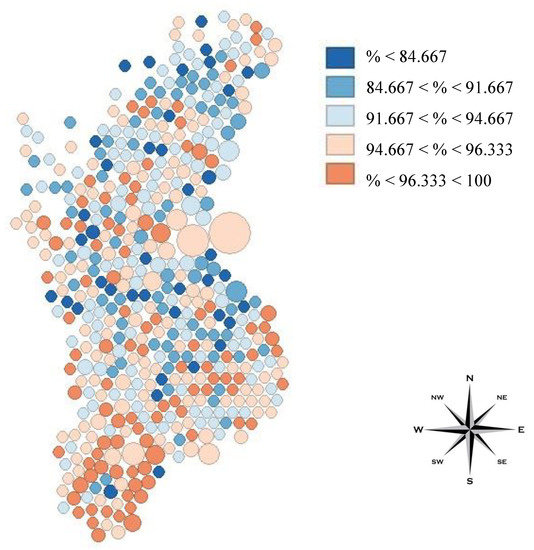 Finally, Figure 3, in order to provide information about the removal efficiencies, shows the amount of wastewater treated (size of the circle) and the average removal efficiencies (colour of the circle). Thus, we can see a clear relationship between size and yields, with larger plants having higher yields. In fact, among the small plants, there are some that do not meet the criteria set out in the regulation [6]. These are small installations that have a low impact associated with them, but even so, they have an impact that is not adequately addressed. In addition, most of the plants with low disposal yields are concentrated in the northern and central parts of the region. This fits with the previous result of higher energy consumption in the southern part of the region. In other words, the southern facilities have higher energy costs in exchange for improved disposal efficiencies and therefore less pollution from discharges and easier wastewater reuse.