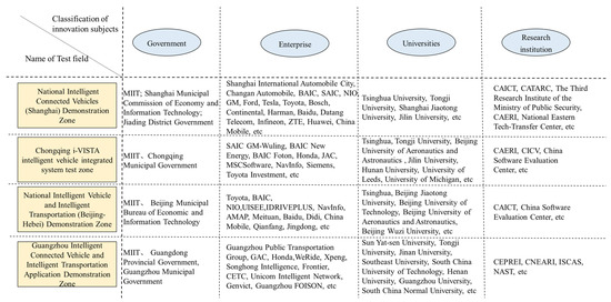 - Play the guiding role of the government, accelerate the pace of policy innovation, and support the collaborative development of the industry from the perspective of a top-level design. First, accelerate the pace of revision of relevant management systems and laws and regulations, especially the standardization and improvement of the management system of self-driving road tests and the right-of-way of autonomous vehicles, business permits, and accident attribution. This is the institutional prerequisite for the large-scale market promotion of autonomous vehicles. Second, promote the establishment of a collaborative innovation platform for the ICV industry based on the test field. Promote the gathering of innovation resources in the test field through strategic planning, financial and tax incentives, as well as other innovative policies, so as to provide convenience and preferential conditions for the stakeholders of the ICV industry chain in the test field. Third, the government takes the lead in building bridges for cross-region linkage among test field. Open up channels for cross-region cooperation from the perspective of top-level design, accelerate test data sharing, the mutual recognition of test results, knowledge and resource sharing, etc., pay more attention to removing barriers to cooperation [44], and promote the establishment of trust relationships among the test field.