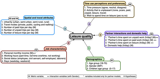 At the intersection of the dimensions of social and mobility context, the key focus of this study is to explore how socioeconomic, spatial context, travel attributes, time use perception, and partner interaction affect leisure quality and how this differs across groups. Leisure quality depends on various variables (Figure 1), which we explain in the following five groups presented with corresponding hypotheses.