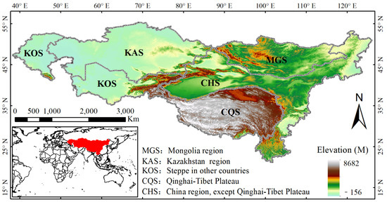 The EAS’s different environmental conditions also lead to zonal changes of grassland vegetation. The major parts of the EAS include the Black Sea-Kazakhstan grassland sub-region, the Mongolian plateau grassland sub-region, and the Qinghai-Tibet plateau grassland sub-region [22]. According to the regime division, this study separated the EAS into five sub-regions: they are Kazakhstan steppe region (KAS), steppe in other countries (KOS) in the west, the Mongolian plateau steppe region (MGS), the Qinghai-Tibet plateau steppe region (CQS), and other steppe regions in China (CHS, Figure 2).