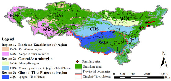 Map of the sub-region divisions, grassland distribution, and location of sampling sites.