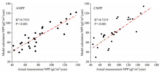 The grassland ANPP simulated by the CASA model in this study was verified based on field survey data collected in August 2015. The detailed geographical information of field observation sites is displayed in Figure 3. The field survey data mainly included open grassland sample data and fenced grassland sample NPP data. The correlation analysis between grassland sample data and modeled ANPP data exhibited a satisfactory estimation (R2 = 0.7553, p < 0.001). The PNPP was validated using the fenced sample NPP data. The fenced observation data were collected from the grazing enclosure sites where grassland ecosystems were undisturbed and have barely been interfered with by humans. Comparisons of the results between simulated PNPP and observed fenced NPP indicated that the PNPP derived from the CASA model showed good agreements with field fenced NPP data (R2 = 0.7219, p < 0.001). This implies that the CASA model has high accuracy and reliability in a simulation of the grassland PNPP.