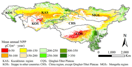 Spatial distribution of mean actual NPP in Eurasian Steppe from 2000 to 2014.