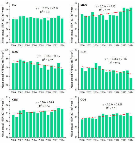 The grassland ANPP of EAS maintain distinct regionalized expression due to its wide range of longitudes (Figure 4). For MGS, the grassland ANPP values was monotonically decreasing from north to south. The high-value areas of grassland ANPP in CHS were mainly distributed in the northeast and south, while the low-value areas were mainly distributed in the northwest and east regions. For CQS, the grassland ANPP values were decreasing gradually from southeast to northwest. In the Kazakh steppe region, the high-value areas of grassland ANPP were mainly distributed in the north and east border area of Kazakhstan, southern Mount Elbrus, and eastern Uzbekistan, while the low-value areas were mainly distributed in the North-Central of Uzbekistan in KOS regions. Histogram analysis was conducted for average annual grassland ANPP in EAS and five sub-regions (Figure 5). The annual ANPP ranged from 43.62 to 50.87 gC/(m2·year) during 2000–2014, with an annual average of 47.36 gC/(m2·year) in the whole EAS. The ANPP of EAS was decreasing, and the decreased ratio was −0.02 gC/(m2·year). Different subregions did not behave comparably. In terms of the overall Kazakh steppe, both KAS and KOS showed a downward trend, with values of −1.14 gC/(m2·year) and −0.26 gC/(m2·year), respectively. Conversely, the grassland in Mongolia China showed an increasing trend. The increasing value of the MGS was the highest (0.73 gC/(m2·year)), followed by CQS (0.33 gC/(m2·year)), and CHS is the lowest, with the value of (0.20 gC/(m2·year)).