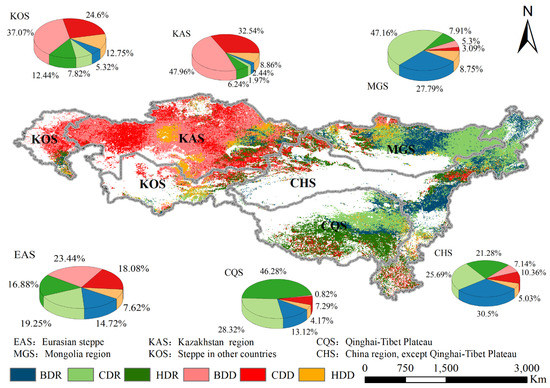 Spatial distribution of grassland degradation and recovery in Eurasian Steppe from 2000 to 2014. (BDR: Co-work of two factors dominated grassland recovery, CDR: Climate-dominated grassland recovery, HDR: Human activities-dominated grassland recovery, BDD: Co-work of two factors dominated grassland degradation, CDD: Climate-dominated grassland degradation, HDD: Human activities-dominated grassland degradation).