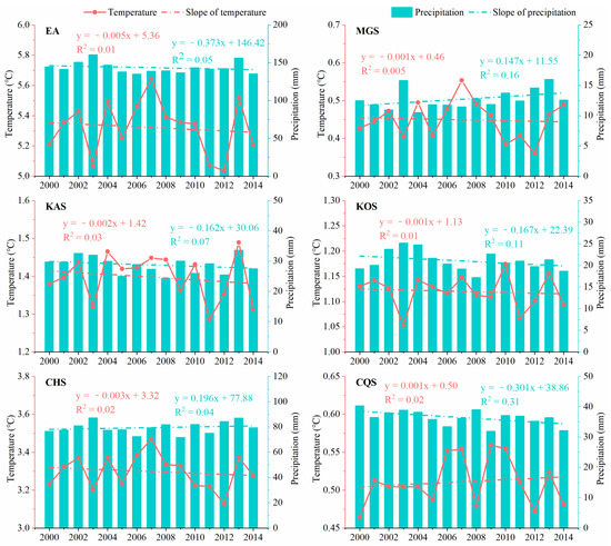 Temporal distribution of mean annual temperature and mean annual precipitation in different regions from 2000 to 2014.