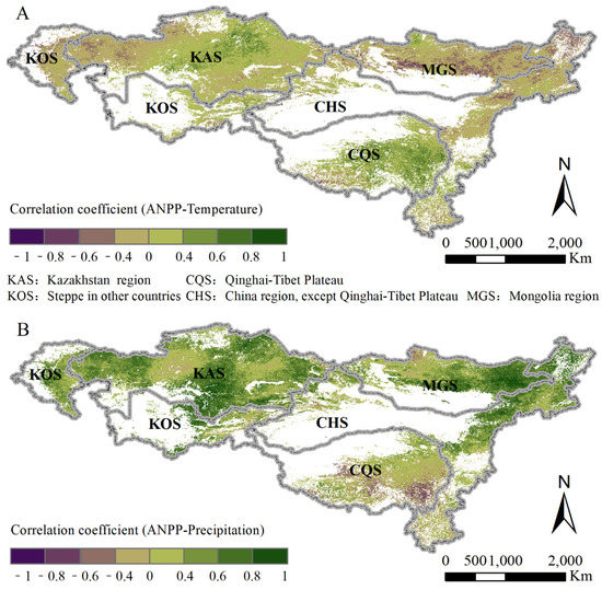 Spatial distribution of the correlation coefficient between ANPP and meteorological factors (A) temperature, (B) precipitation from 2000 to 2014.