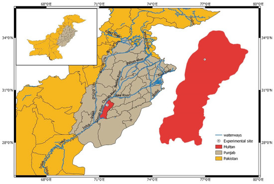 A field experiment was carried out in Multan, the South-Punjab region of Pakistan, at 30.1598° N, 71.4502° E; altitude 129 m (Figure 1). The study site falls under the country’s arid subtropical region, with an annual average temperature of 32.6 °C and average annual precipitation of 186.8 mm. The diurnal variations observed in the study area fluctuated, with average air temperature varying from 26–49 °C and 4–23 °C throughout summer and winter periods, respectively. The maximum rainfall was recorded during the monsoon season (July and August) and was extremely varied. There was very little rainfall during the winter season, which meant that typical crop water demands were not met. The regular values of minimum (Tmin), maximum (Tmax), sunshine hours, growing degree days (GDDs) (above a specific threshold temperature and rainfall) observed throughout the study period are presented in Supplementary Materials Figure S1.