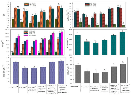 Effect of co-application of BC and nitrogen fertilizer on the leaf area index (LAI), crop growth rate (CGR), total dry matter (TDM), total intercepted PAR, radiation use efficiency for the total dry matter (RUE-TDM) and radiation use efficiency for grain yield (RUE-GY) at growth stages of wheat crop under arid environmental conditions. * (Letters “a–d” are to show the mean difference in different groups at p ≤ 0.05 by Tuckey HSD test).