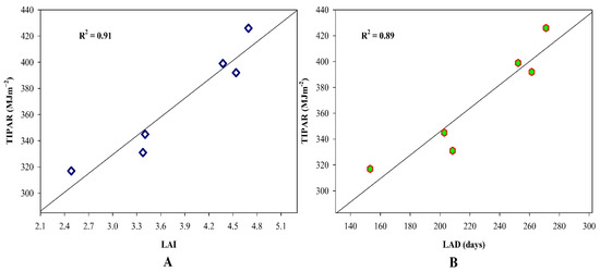 Relationship between peak LAI (A) and cumulative lead area duration (B) with total intercepted photosynthetically active radiation (TIPAR) for the wheat crop.