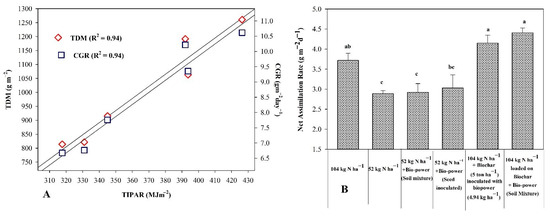 The RUE trend for TDM and grain yield (GY) was observed similar to that of IPAR. The results revealed a positive relationship with a high-value determination coefficient (R2 = 0.94) between TIPAR and TDM and CGR, which showed a dependency of biomass production and growth rate for light interception through the wheat crop canopy (Figure 3 and Figure 4). Treatment vi (biochar application rate (5 t ha−1) loaded with nitrogen and added in combination with soil mixture bio-fertilizer) attained the highest RUE for TDM and GY (3.0, 1.02 g MJ−1) production compared to the other treatments and the positive control with although this was not statistically significant (p > 0.05) (Figure 2). A lower RUE for TDM and grain yield was attained for treatment ii (52 kg N ha−1 application). Nitrogen has a strong and positive association with growth, especially dry matter accumulation. However, biochar serves to promote this further through a positive relationship with biomass and TDM. The highest NAR (4.40, 4.14 and 3.71 g dm−2 day−1) was produced by the full N fertilizer application (104 kg N ha−1 either loaded on biochar or applied in conventional method). While the lowest NAR (2.89, 2.91 gdm−2 day−1) were produced where only a half N fertilizer applied (52 kg N ha−1) (Figure 4). Supporting the fact that NAR depends on N fertilization and increases by the N application.