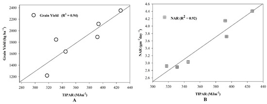 Relationship between total intercepted photosynthetically active radiation (TIPAR) and grain production and NAR of the wheat crop.