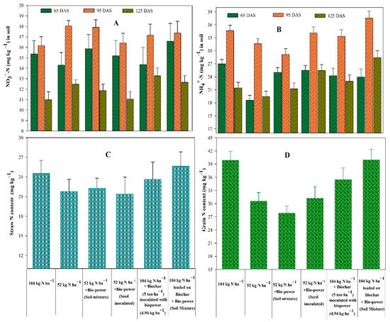 The effect of co-application of BC and nitrogen fertilizer on NO3− and NH4+ (65, 95 and 125 DAS) on soil (A,B), and wheat straw and grains (C,D) on wheat crop under arid environmental conditions.