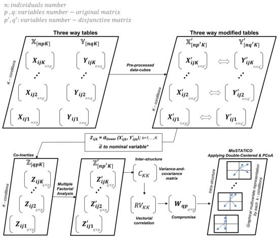 To implement the methodology of analysing the co-structure between two sets of variables measured on the same individuals, a suggestion made by Abdi et al. [30] for the distance matrix based DISTATIS method is adopted. For mixed data, the distance metric of Gower [125] is used, between the variables of the paired matrices and , having previously merged these matrices in each K-condition to obtain the following set of K-distance matrices of dimension :