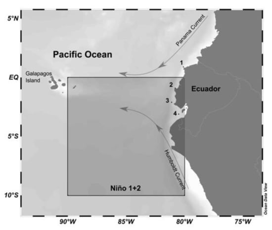 The coast of Continental Ecuador is located in the eastern equatorial Pacific (Figure 2), with the north influenced by the warm current of Panama (heading south and producing an increase in SST and decrease in nutrients; begins in December and intensifies in February and April) and the south by the cold stream of Humboldt (heading north, its waters are coldest, high in salinity and rich in nutrients; it mainly presents in July and November, weakening in December), and there are two climatic seasons (dry and rainy) [129]. The southern part is considered to be the most significant tropical estuary on the west coast of South America [120]. However, much of its coastline is contained in the Niño Region 1 + 2 (0°–10° S, 90°–80° W), an area sensitive to the variations produced by the surface sea temperature from the Central Pacific due to the presence of ENSO events (El Niño—La Niña), which are events that alter the physical and chemical parameters of the sea. On the west coast of South America, the most evident signs of ENSO are manifested in ocean–atmospheric systems and by the impact it has on natural ecosystems [130].