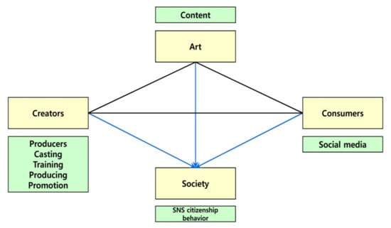 These figure elements can be explained as follows. (1) Producers. These are the key players in the industry for K-pop’s success in overseas markets. These entertainment agencies are responsible for systematizing the entire production process of casting, training, producing, and promotion for overseas markets [6,21,26,32]. That is, entertainment agencies have systematized the production process and carefully prepared to enter overseas markets from a long-term perspective. Specifically, many studies have described Korea’s well-developed system of intense training of possible K-pop idols to pick out just a few stars to create a differentiated competitive advantage [6,21,26,32]. The implication is that, even from the planning stage, agencies target the global market and polish the skills of idol groups. The specifics of the systematization of the entire production process, from casting to promotion, include the following.