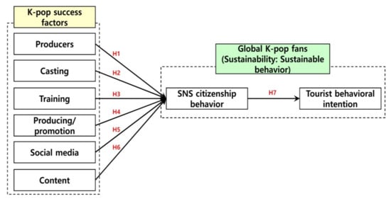 As of yet, however, the research on K-pop has failed to determine its success factors and perform empirical evaluations linked to sustainability, that is, sustainable behavior (e.g., SNS citizenship behavior and tourist behavioral intention). To fill this gap, the objective of this study is to first derive the success factors of K-pop and then empirically test whether they can increase SNS citizenship behavior and increase tourist behavioral intention. To that end, we established the following two research questions: