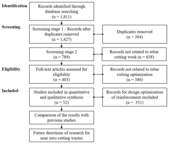 Based on literature searched for on 1 December 2020, 1811 records were finally identified, as shown in Figure 1, excluding duplicated literature or literature not related to the subject of this study. Among them, duplicated 384 records were screened and 638 and 386 records that were not relevant to the rebar cutting work and rebar cutting optimization were excluded, respectively, to finally select 403 full-text articles. Then, 351 literatures related to design optimization of the RC components or frames were excluded. The reason is that design optimization of RC corresponds to pre-processing research of rebars optimization, while CWM of rebars covered in this study corresponds to post-processing research. As a result of reviewing some of the literature [50,51,52,53,54,55,56,57,58,59,60,61,62,63,64,65,66,67,68,69,70,71,72,73,74,75,76,77,78,79,80,81] related to design optimizations of rebars, it was confirmed that they are related to design optimization of RC components such as slab [50,51,52,53,54,55,56,57], beam [58,59,60,61], column [62,63,64,65], foundation [64], and wall [66,67,68], and design optimization of RC frames such as bridges [69,70,71] and building [72]. In addition, many studies related to design optimization have been well-organized in the review article [37].