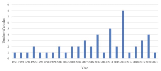 Figure 2 shows the number of articles published by year. One or two articles were published every year until 2004, but after 2012, the number of articles increased until 2016 with the development of various techniques, including computer-aided design (CAD) and building information models (BIM). It is confirmed that the number of articles dropped sharply to one in 2017 and increased again. In the past, cutting wastes were approached from an economic perspective; however, recently, research has been conducted from a sustainable construction perspective.