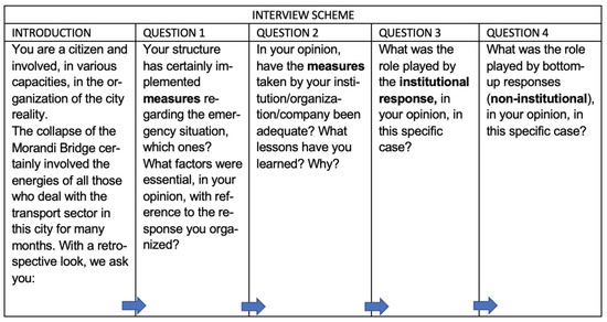 Organizations involved were the Genoa municipality and port authority, regional and urban public transport companies’ managers, politicians, executive officers, and figures involved in the local informal response. The interviewees were asked questions about their own structures and the specific competences they were in charge of. Wherever possible, interviewees were invited to exemplify the typical responses the organizations were expected to deliver, such as new technical solutions (viability, circulation, parking, fares) related to their job assignment, but also to speak on what they had observed during the post-event phase in the change of the city transport scope (Figure 2). The sequence of questions also intended to enter into the merits of what the formal collaborative relationships between the different subjects are and how this relationship has changed according to the circumstances.